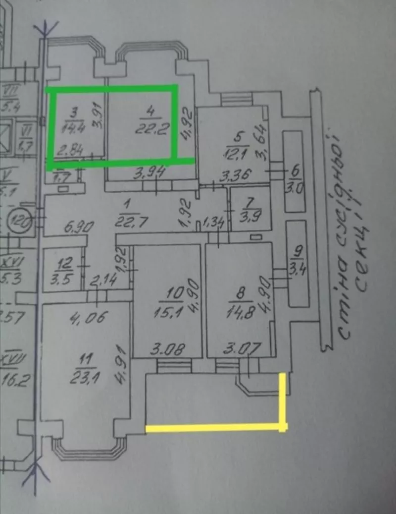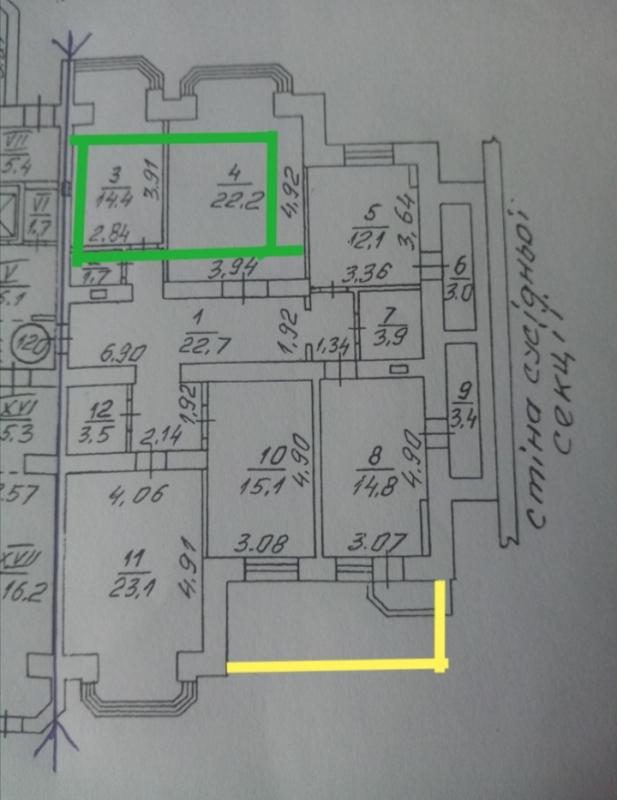 Індивідуальне підключення до система опалення незалежна від центральних стояків. Площу квартири легко можна розширити: балкон (жовта лінія на плані) і підвальне приміщення (зелена лінія) можуть перетворитися на простору кімнату безпеки чи спортзал — +40 м² до вашого затишного світу.