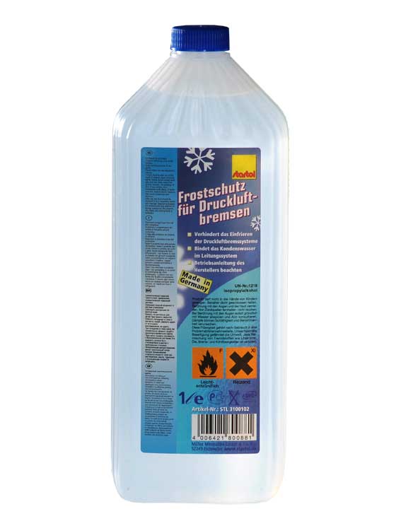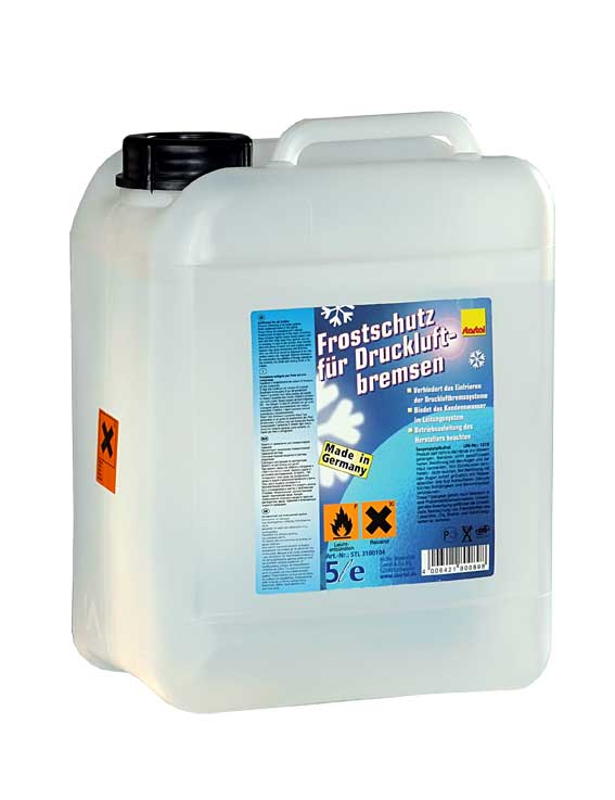 Bremsenfrostschutz / Защита тормозов от замерзания - базирующаяся на спиртах защита от мороза для пневматических тормозов. Связывает водный конденсат в системе управления и предотвращает замораживание пневматических тормозных систем зимой. Соблюдать инструкции по эксплуатации производителей.